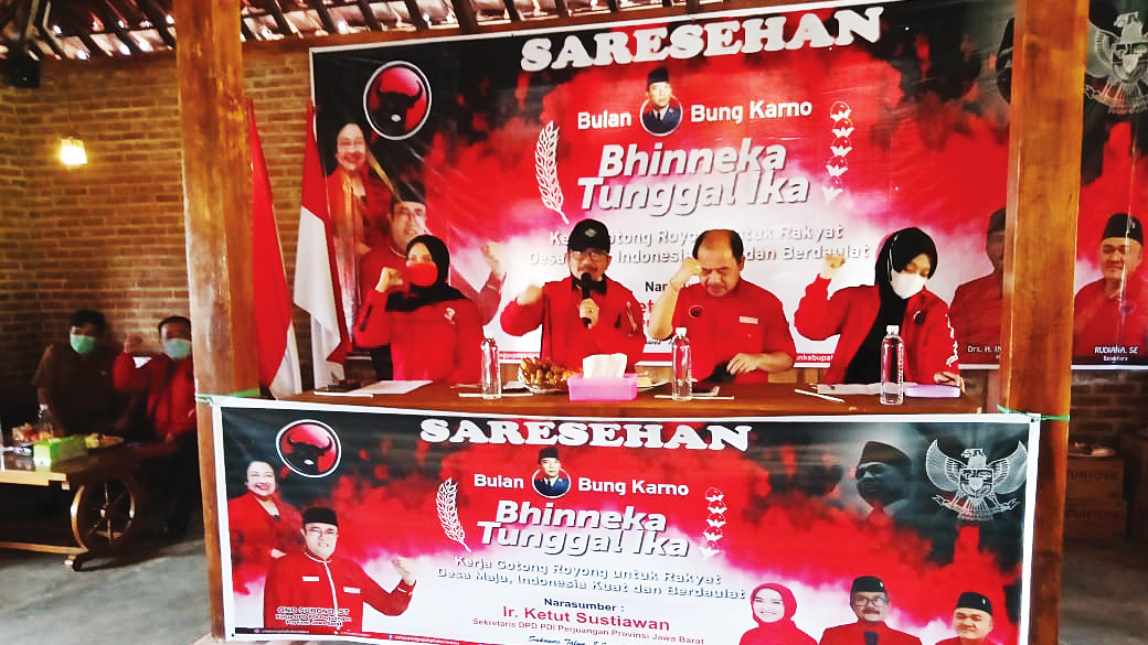 Sementara itu Bendahara DPC PDIP, Rudiana SE menjelaskan tema perayaan Bulan Bung Karno tahun 2021 yakni Bhineka Tunggal Ika, gotong royong untuk rakyat desa maju, Indonesia kuat dan berdaulat. Menurutnya, desa merupakan ujung tombak pemerintahan yang berada di garda terdepan pelayanan publik, sekaligus tempat hidupnya tradisi dan adat Istiadat.