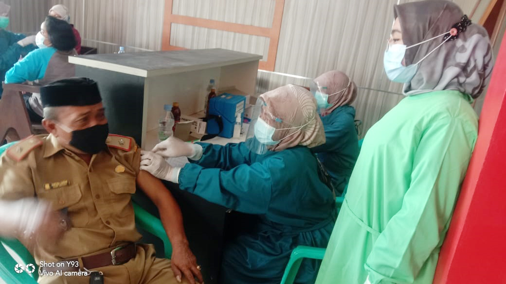 KABUPATEN CIREBON, SC- Warga Lansia Desa Wotgali, Kecamatan Plered, Kabupaten Cirebon menerima vaksinasi tahap pertama di aula desa setempat, Senin (14/6/2021).