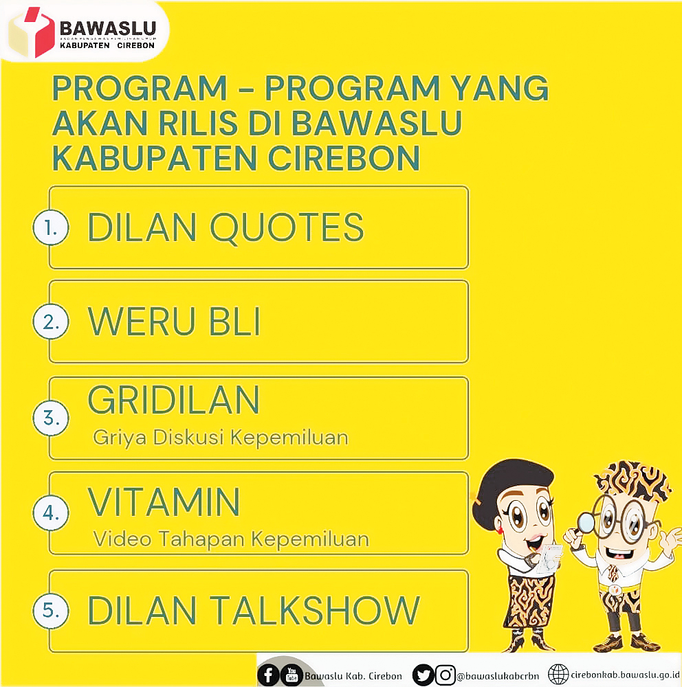 Lebih lanjut Khoir mengatakan, selain program tersebut ada juga program Griya Demokrasi Kepemiluan (GriDiLan), yakni, diskusi program demokrasi yang wajib diikuti oleh seluruh jajaran Bawaslu Kabupaten Cirebon. Program ini, kata dia, digelar setiap dua minggu sekali selama satu bulan.