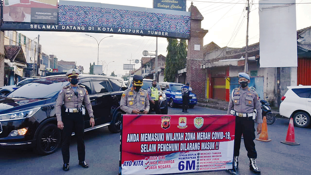KABUPATEN CIREBON, SC- Jajaran Polresta Cirebon melakukan penyekatan sejumlah ruas jalan di Kecamatan Sumber, Selasa (22/6/2021).