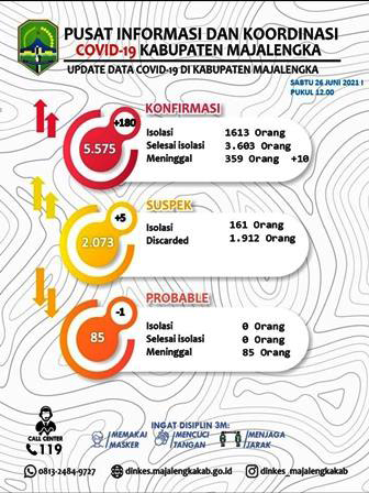 Sementara itu dari data Satgas Covid-19 Majalengka hari ini tercatat ada penambahan kasus Covid-19 sebanyak 180 orang dari total jumlah 5575 orang dari akumulasi selama wabah 2 tahun terjadi hingga hari ini. Kemudian, yang melakukan isolasi mandiri juga mengalami kenaikan sebanyak 139 orang. Sedangkan yang dirawat 30 orang di RSUD Majalengka, 55 orang di RSUD Cideres dan 25 orang di luar Kabupaten Majalengka. Adapun yang meninggal dunia hari ini tercatat ada 10 orang dan 22 orang dinyatakan sembuh dari jumlah 3602 orang selama dua tahun terakhir ini. (Dins)