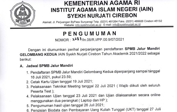 Seperti tertuang dalam surat pengumuman yang dikeluarkan IAIN Syekh Nurjati Cirebon bernomor 2283/In.08/R.I/PP.00.9/07/2021 tentang Pengumuman perihal perpanjangan pendaftaran SPMB Jalur Mandiri IAIN Syekh Nurjati Cirebon tahun akademik 2021/2022.
