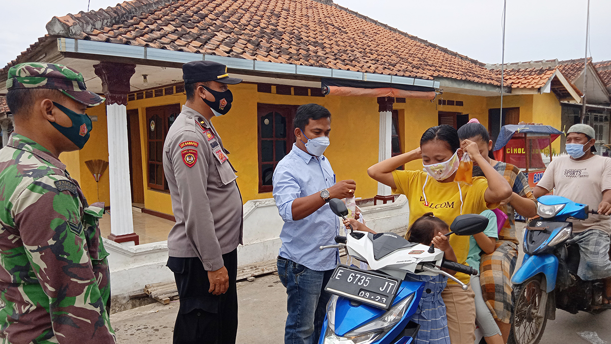KABUPATEN CIREBON, SC- Pemerintah Desa Prajawinangun Wetan, Kecamatan Kaliwedi, Kabupaten Cirebon, bersama Polsek Kaliwedi dan Satpol PP kecamatan menbagi-bagikan masker kepada pengguna jalan dalam rangka pelaksanaan PPKM Darurat di sepanjang jalan desa setempat, Rabu (14/7/2021).