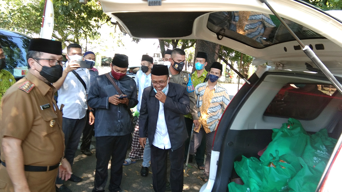 SEBANYAK 4.250 paket sembako untuk pengelola kegiatan keagamaan di seluruh Kabupaten Cirebon didistribusikan. Bupati Cirebon, H Imron MAg menyerahkan bantuan tersebut secara simbolis kepada tiga orang perwakilan pengelola kegiatan keagamaan di halaman kantor Baznas Kabupaten Cirebon, Selasa (27/7/2021).