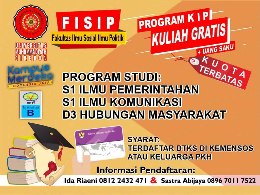 Dekan Fisip UMC, Drs Subhan,M.Si menghimbau, “Barangkali ada siswa yang berminat untuk kuliah di FISIP Universitas Muhammadiyah Cirebon (UMC) prodi S1 Ilmu Pemerintahan, S1 ilmu Komunikasi dan D3 Humas, melalui seleksi program beasiswa KIP. Dengan persyaratan utama memiliki kartu KIP, KKS dan PKH, alumni SLTA angkatan 2021, 2020 dan 2019. Kuota terbatas. Bisa mendaftarkan ke fisip, sampai tanggal 10. Tolong sampaikan ke saudara, tetangga, kerabat dan lainnya.”