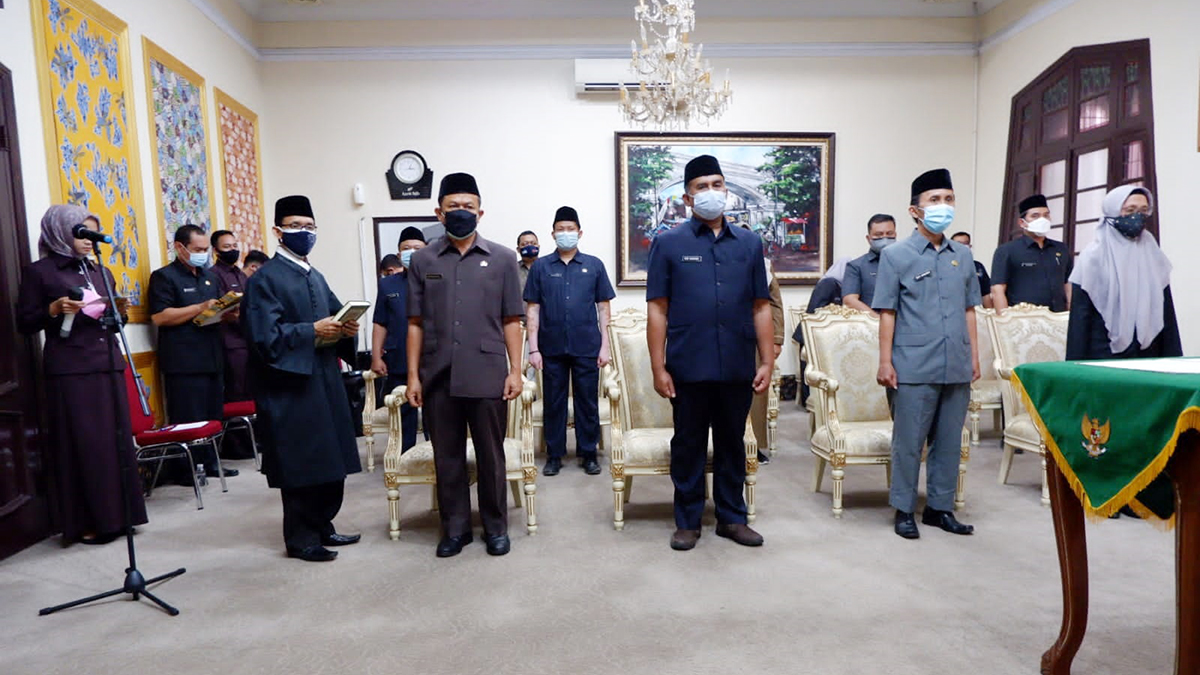 KOTA CIREBON, SC- Wali Kota Cirebon, H Nashirudin Azis melantik sembilan pejabat eselon III dan eseolan IV di ruangan Kanigara, Balaikota Cirebon, Senin (9/8/2021).