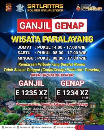 MAJALENGKA, SC- Satlantas Polres Majalengka menerapkan kebijakan ganjil-genap di kawasan objek wisata Paralayang, Kecamatan/Kabupaten Majalengka, Jawa Barat. Rencananya, kebijakan itu akan mulai diberlakukan Jumat (17/9/2021) besok.