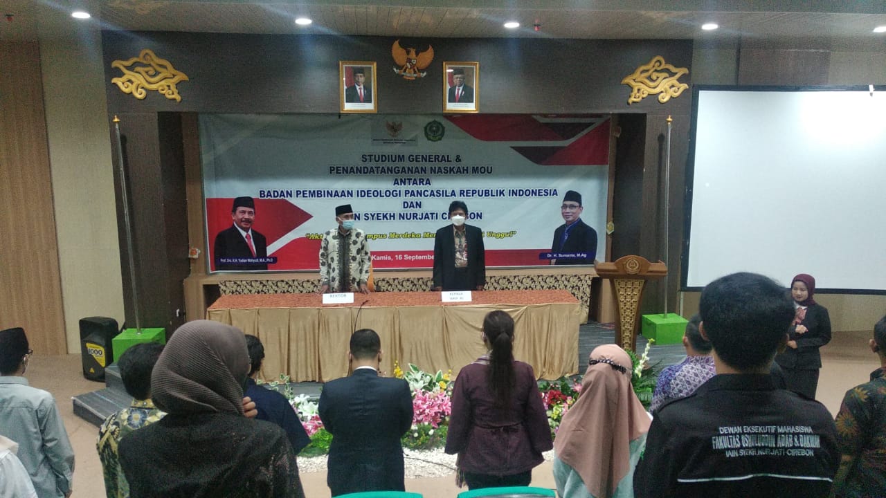 CIREBON, SC- Badan Pembinaan Ideologi Pancasila (BPIP) menggelar studium general dan penandatanganan naskah Memorandum of Understanding (MoU) dengan Institut Agama Islam Negeri (IAIN) Syekh Nurjati Cirebon di kampus setempat, Kamis (16/9/2021).
