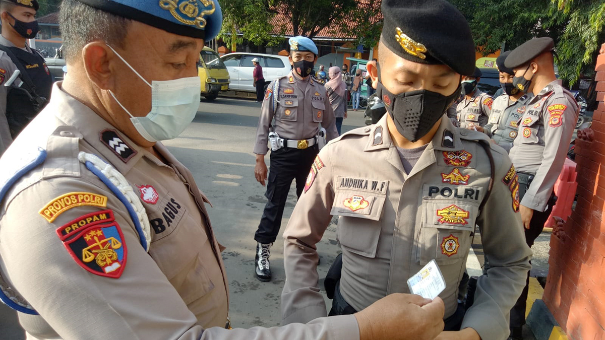 KABUPATEN CIREBON, SC- Para personel Polresta Cirebon diperiksa kelengkapan administrasinya sebelum memasuki Mako Polresta Cirebon. Pemeriksaan oleh Sie Propam Polresta Cirebon tersebut dilaksanakan tepat sebelum para personel Polresta Cirebon mengikuti apel pagi, Senin (27/9/2021).