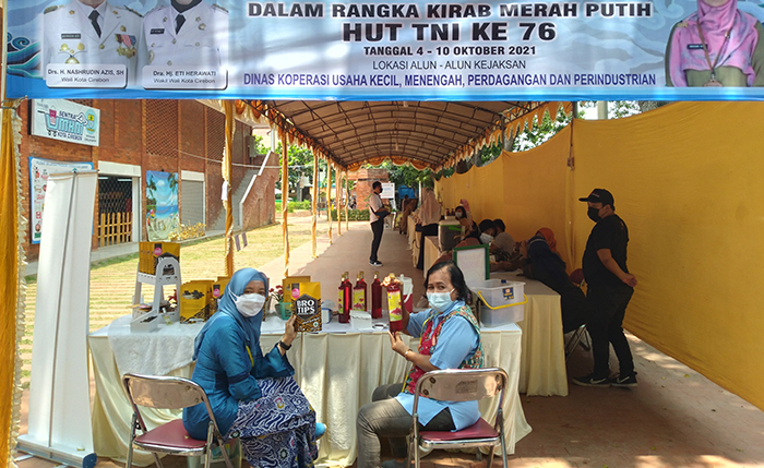 KOTA CIREBON, SC- Dalam rangka kirab merah putih hari ulang tahun (HUT) TNI ke 76 tahun Dinas Koperasi Usaha Kecil Menegah, Perdagangan dan Perindustrian (DKUKMPP) Kota Cirebon menggelar Gebyar UMKM di area alun-alun Kejaksan.