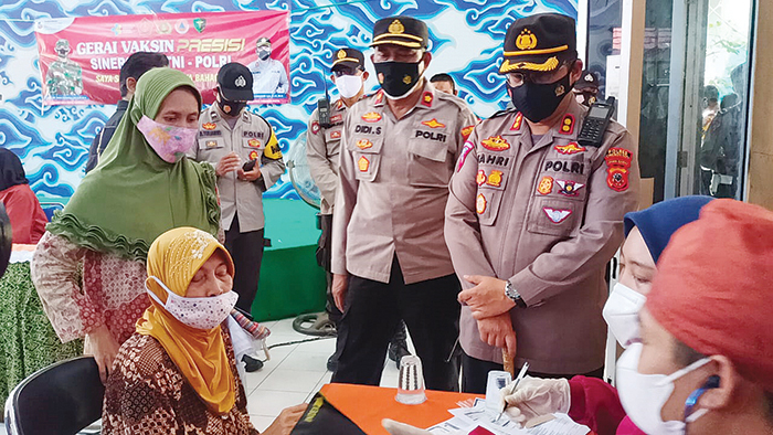 KOTA CIREBON, SC- Kapolres Cirebon Kota (Ciko), AKBP M Fahri Siregar, didampingi Kapolsek Selatan Timur, Kompol Didi Suwardi dan Kasat Lantas AKP La Ode Habibi Ade Jama, meninjau pelaksanaan vaksinisasi Covid-19 bagi para lansia yang digelar di sejumlah kecamatan di Kota Cirebon.