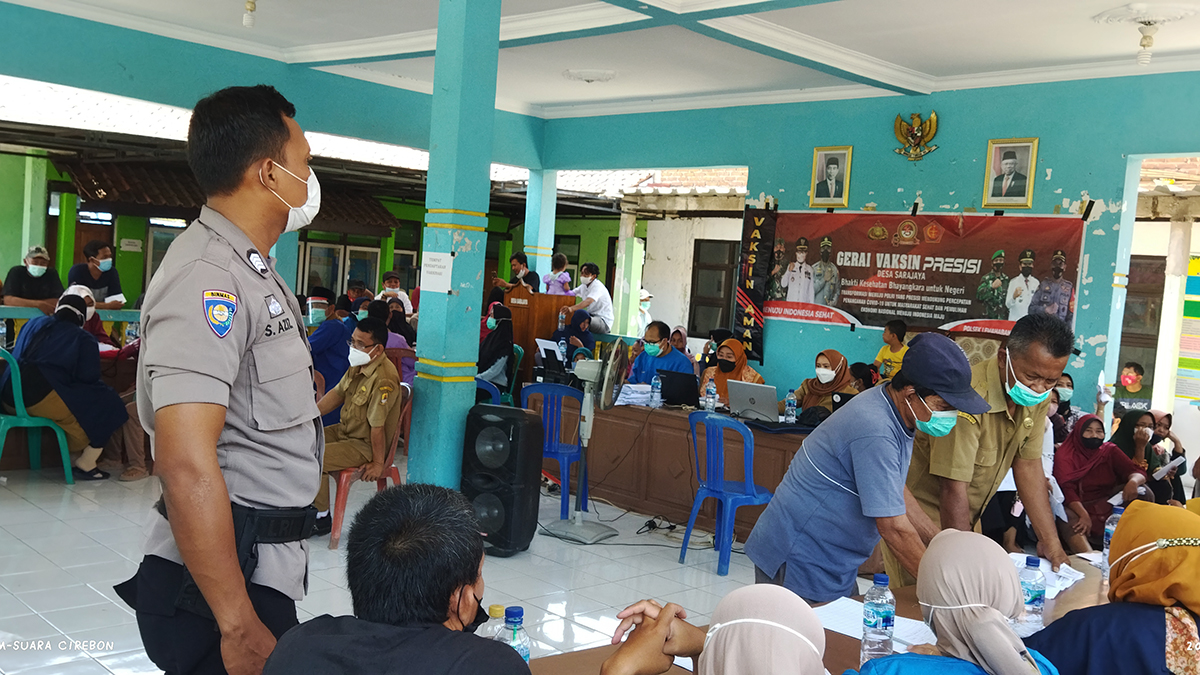 KABUPATEN CIREBON, SC- Masyarakat Desa Sarajaya, Kecamatan Lemahabang, Kabupaten Cirebon antusias mendatangi tempat diadakannya vaskinasi Covid-19 yang dilakukan pihak Puskesmas Sindanglaut, Selasa (12/10/2021).
