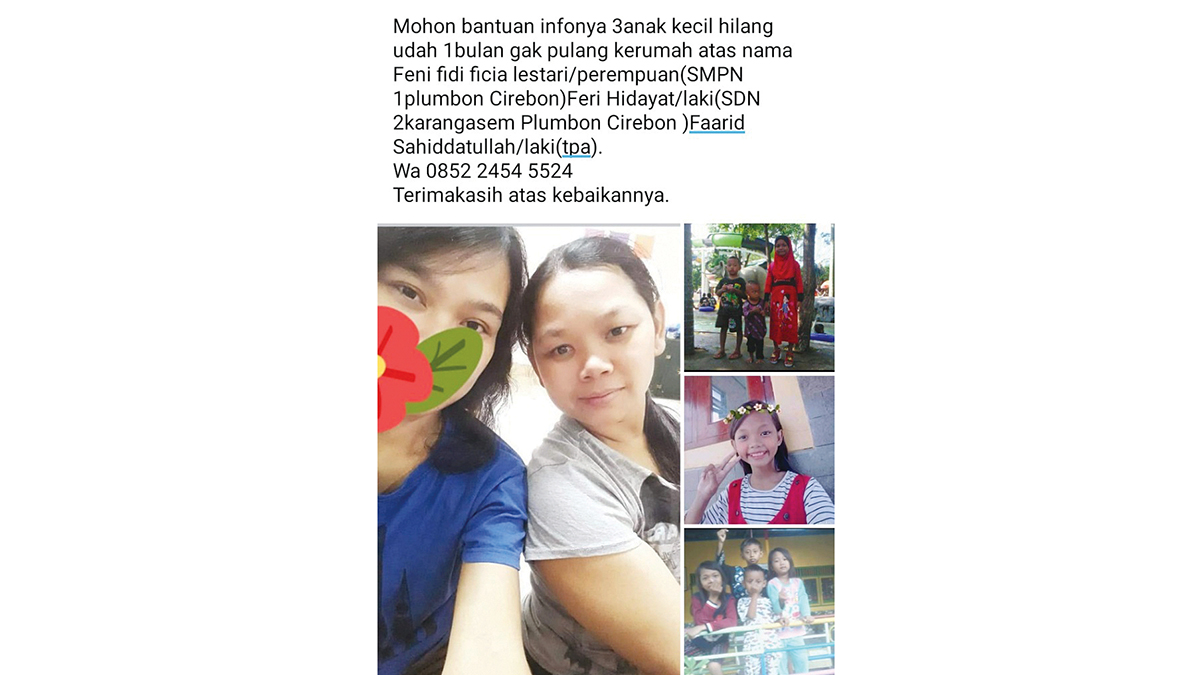 Ia mengaku belum melaporkan masalah itu ke polisi karena masih bingung. Saat ini dirinya hanya bisa memviralkan foto anak-anaknya dengan keterangan “Mohon bantuan infonya 3 anak kecil hilang udah 1 bulan gak pulang ke rumah …..” lengkap dengan nama sang anak melalui media sosial.