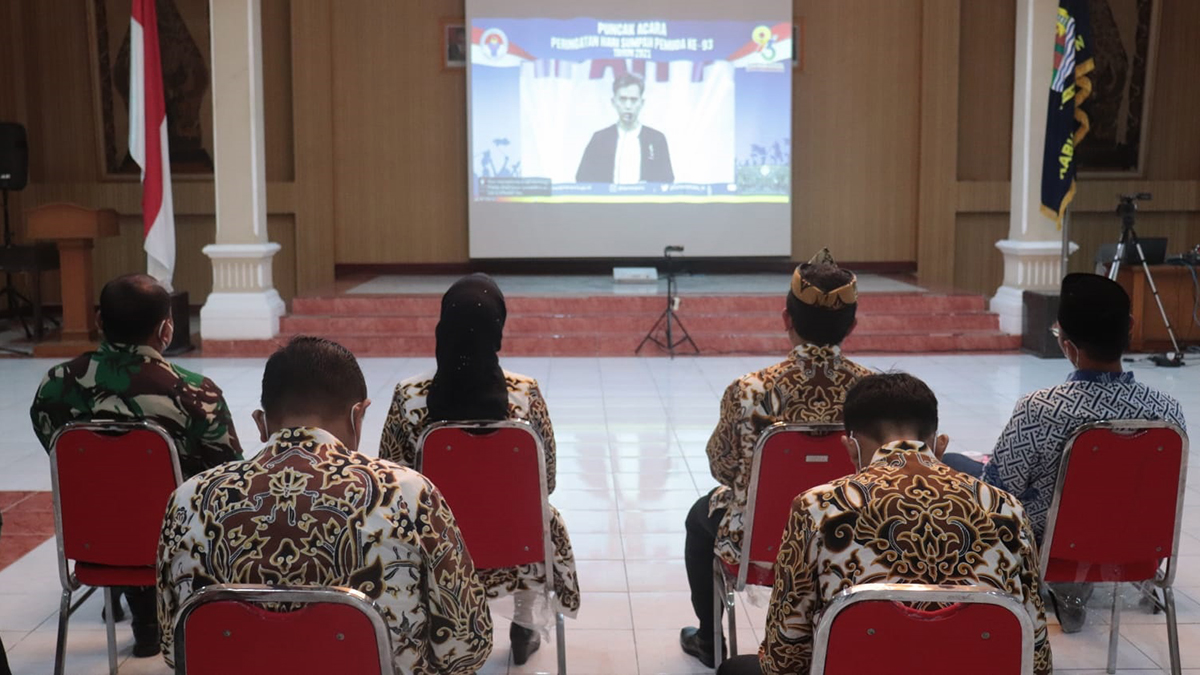 KABUPATEN CIREBON, SC- Bupati Cirebon, H. Imron, M.Ag bersama unsur Forkopimda Kabupaten Cirebon dan sejumlah OPD mengikuti peringatan ke-93 Hari Sumpah Pemuda tahun 2021 secara virtual di ruang Nyimas Gandasari Kantor Setda, Kamis (28/10/2021).