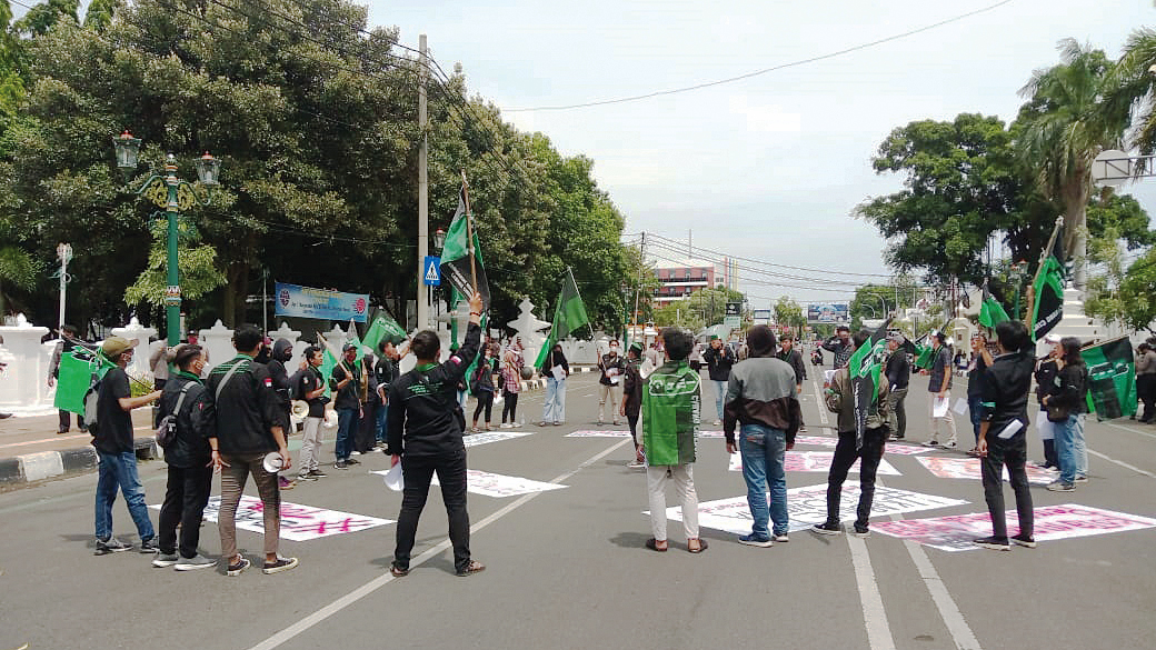 Dalam aksi yang dilakukan di depan gedung Balai Kota Cirebon, massa HMI menyuarakan persoalan politik, perekonomian hingga jati diri bangsa ini yang dinilai masih terkungkung.