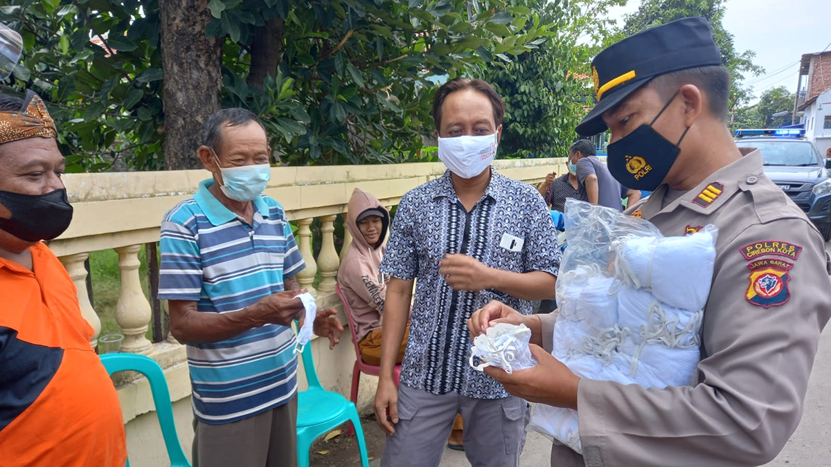 KOTA CIREBON, SC- Kepala Satuan Pembinaan Masyarakat (Kasat Binmas) Polres Cirebon Kota membagikan ribuan masker kepada warga yang hendak memilih calon kuwu pada pemilihan kuwu (Pilwu) serentak 2021.