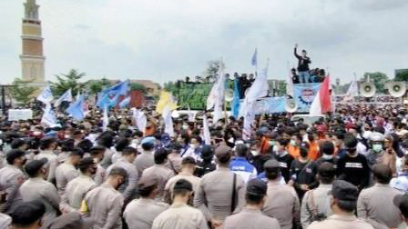 Dalam orasinya, perwakilan buruh menyatakan tidak terima dengan penetapan UMK 2022 yang telah disepakati oleh Dewan Pengupahan dalam rapat pleno pada Selasa (23/11/2021) kemarin.