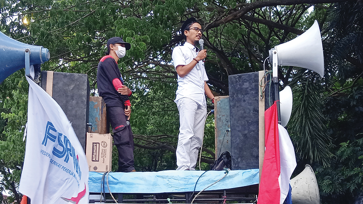 “Kemarin 25 hakim MK menyatakan UU Cipta Kerja cacat formiil. MK menyatakan UU Ciptaker masih berlaku hingga 2 tahun ke depan, Menteri Koordinator pun langsung menyatakan masih berlaku, begitupun dengan Presiden Jokowi menyampaikan UU Ciptaker masih berlaku hingga 2 tahun kedepan,” teriak Machbub orasinya.