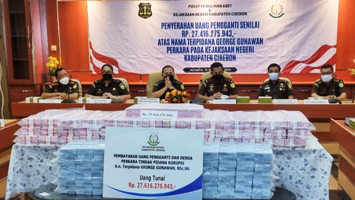 JAKARTA, SC- Pusat Pemulihan Aset Kejaksaan Agung (Kejagung) bersama Kejaksaan Tinggi Jawa Barat dan Kejaksaan Negeri (Kejari) Kabupaten Cirebon menyerahkan uang pengganti senilai Rp.27.416.275.943 dan uang denda sebesar Rp200 juta atas nama terpidana George Gunawan.