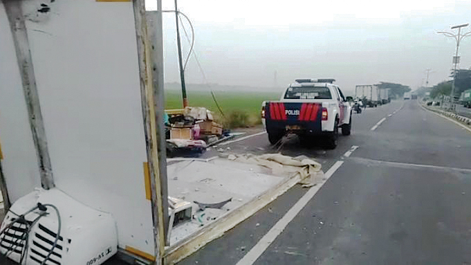 “Tidak ada kendaraan atau orang lain yang terlibat atau terluka, hanya sopir kendaraan truk freezer saja. Ini kecelakaan tunggal,” tegasnya.