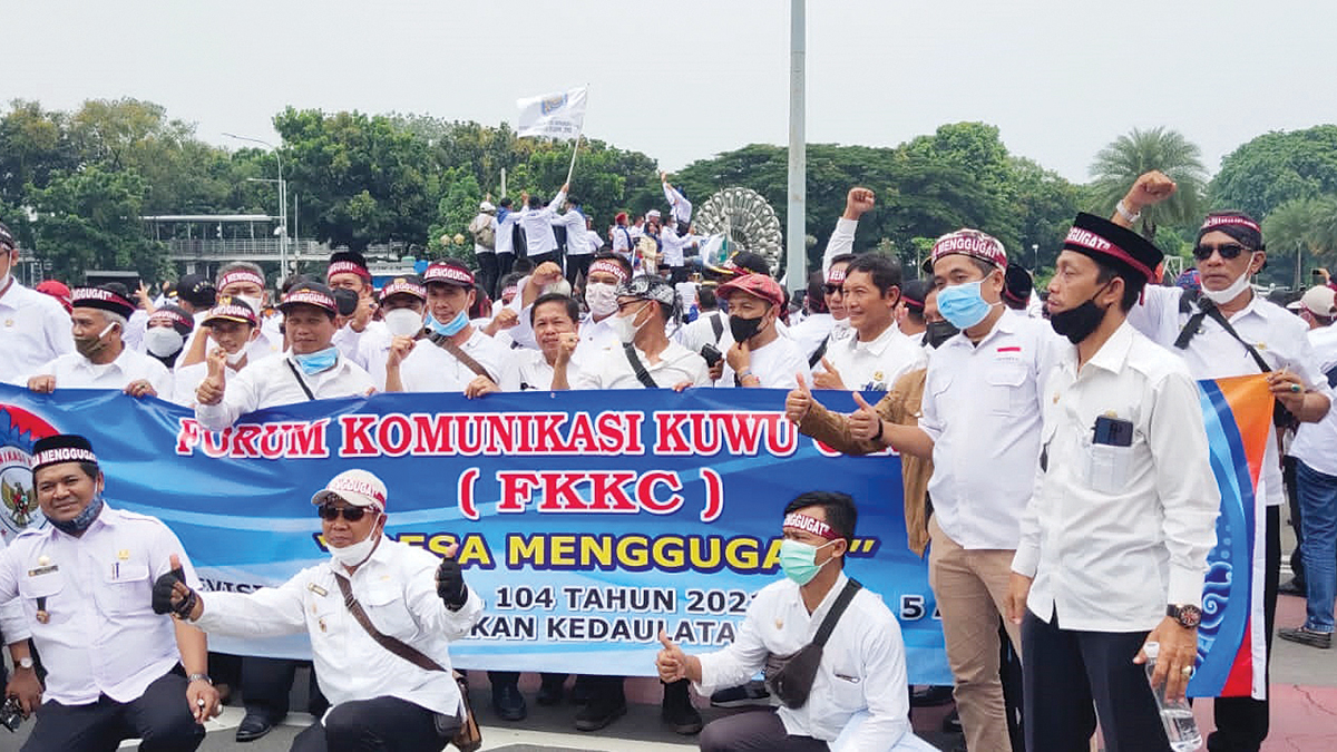 JAKARTA, SC- Ratusan kuwu yang merupakan anggota Forum Komunikasi Kuwu Cirebon (FKKC) bersama ribuan anggota Asosiasi Perangkat Desa Indonesia (APDESI) menggelar aksi demonstrasi di kawasan Monas dan Patung Kuda, depan Istana Negara, Jakarta, Kamis (16/12/2021).