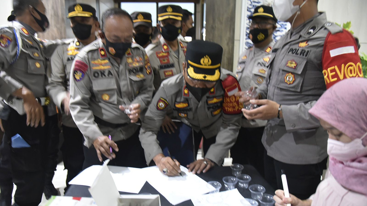 KABUPATEN CIREBON, SC- Puluhan personel Polresta Cirebon menjalani tes urine di Aula Pesat Gatra Mapolresta Cirebon, Selasa (4/1/2021). Tes urine yang diikuti Pejabat Utama (PJU) dan Kapolsek Jajaran Polresta Cirebon tersebut, dalam rangka memberikan contoh kepada seluruh anggota Polresta Cirebon.
