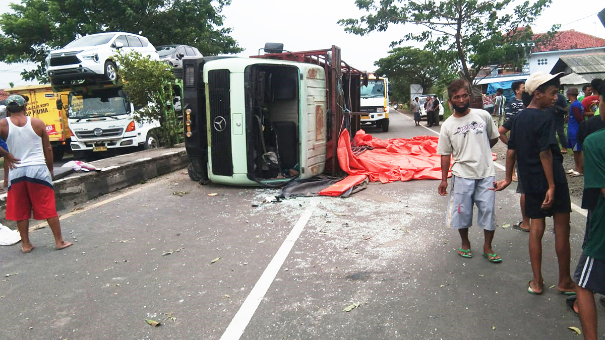 KABUPATEN CIREBON, SC- Sebuah truk tronton bermuatan ban yang melaju dari arah Cirebon menuju Wonosari terguling di Jalan Pantura, tepatnya di Blok Karang Anyar, Desa Gebang Kulon, Kecamatan Gebang, Kabupaten Cirebon, Selasa (11/1/2022) sekitar pukul 10.30 WIB.