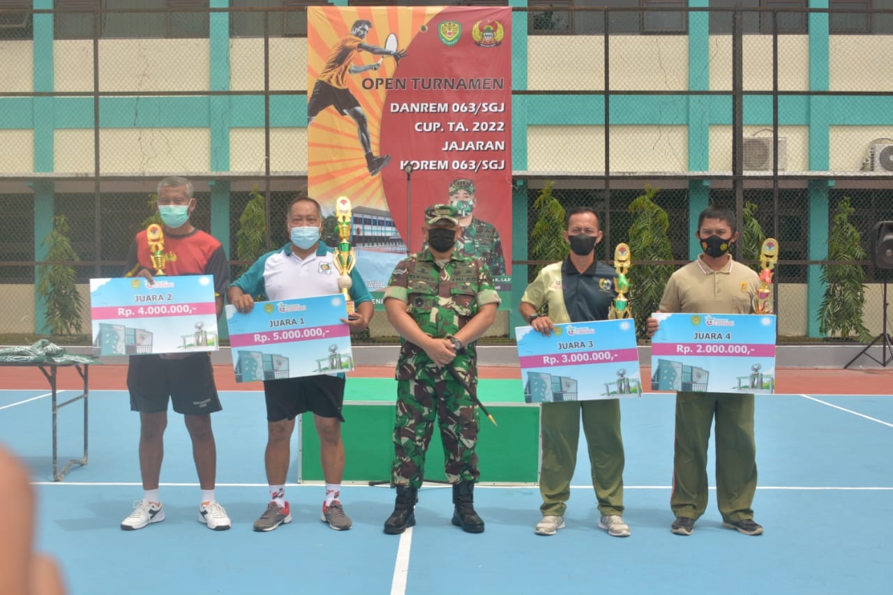 KOTA CIREBON, SC- Perhelatan open turnamen tenis lapangan Danrem 063/SGJ Cup 2022 telah usai dilaksanakan. Danrem 063/SGJ Kolonel Inf Elkines Villando Dewangga,.K.S.A.P menutup pelaksanaan turnamen tersebut bertempat di Lapangan Tenis Denkesyah 03.04.03 Cirebon, Jumat (14/1/2022).
