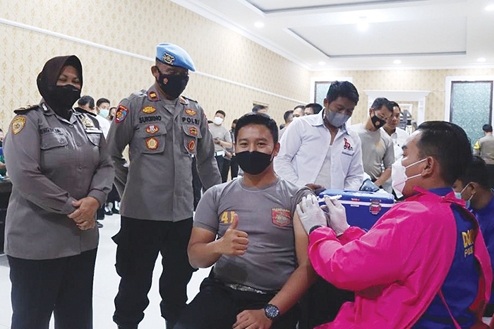 Vaksinasi yang dilaksanakan di Aula Sanika Sastyawada Polres Cirebon Kota ini menggunakan jenis vaksin Astrazeneca.