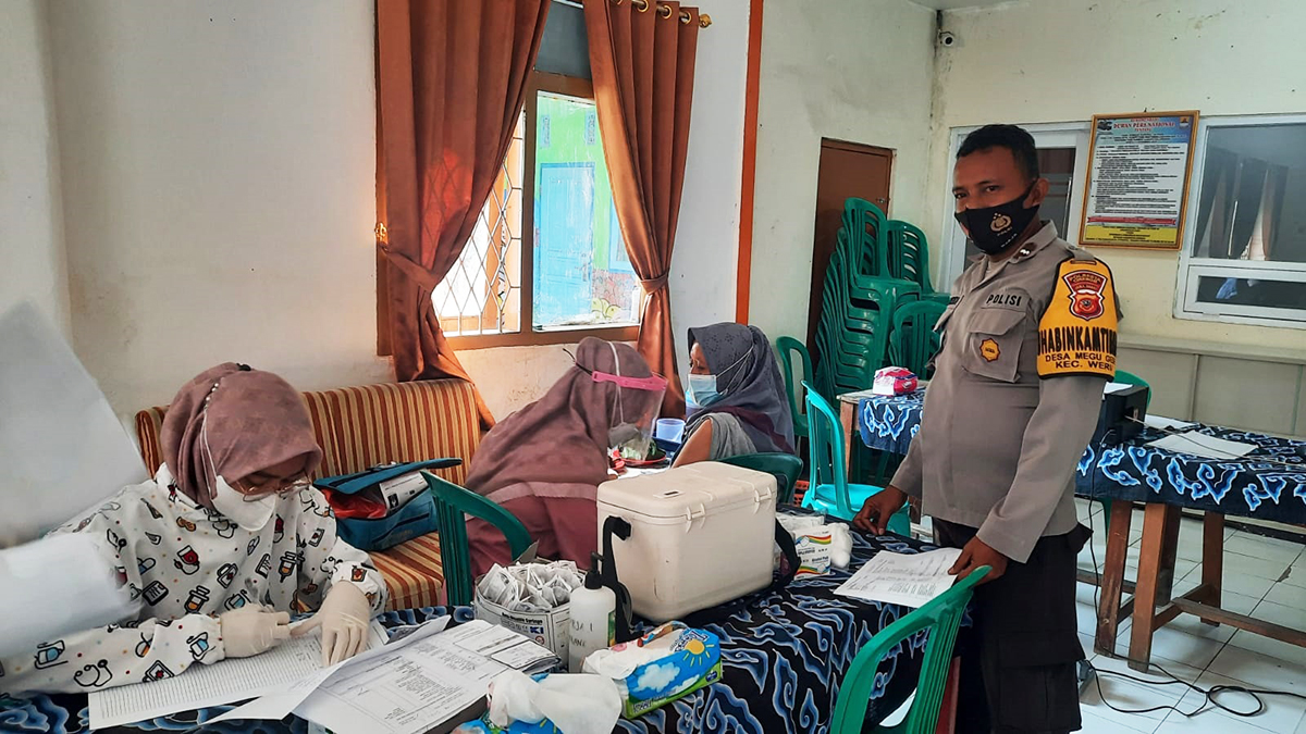KABUPATEN CIREBON, SC- Personel Bhabinkamtibmas Desa Megu Gede, Kecamatan Weru, Kabupaten Cirebon dari Polsek Weru, Polres Kota Cirebon mendampingi vaksinasi covid-19 untuk para lansia dan warga, kegiatan tersebut berlangsung di aula kantor desa setempat.