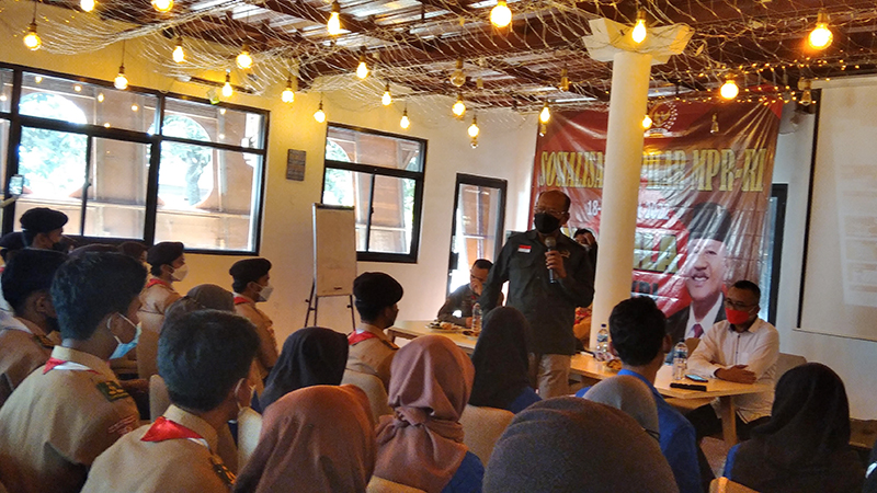 MAJALENGKA, SC- Ratusan mahasiswa dan anggota Pramuka dari Kwartir Cabang (Kwarcab) Majalengka mengikuti Sosialisasi Empat Pilar Kebangsaan. Sosialisasi yang diselenggarakan di gedung pertemuan Obyek Wisata Paralayang dilakukan oleh Anggota DPRRI/MPR RI H. Sutrisno, Sabtu (19/3/2022).
