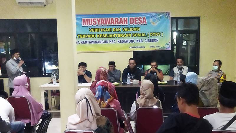 KABUPATEN CIREBON, SC- Desa Kertawinangun, Kecamatan Kedawung, Kabupaten Cirebon, melaksanakan Musyawarah Desa (Musdes) terkait Verifikasi & Validasi (Verval) Data Terpadu Kesejahteraan Sosial (DTKS) tahun 2022, di kantor desa setempat, Selasa (12/4/2022) malam