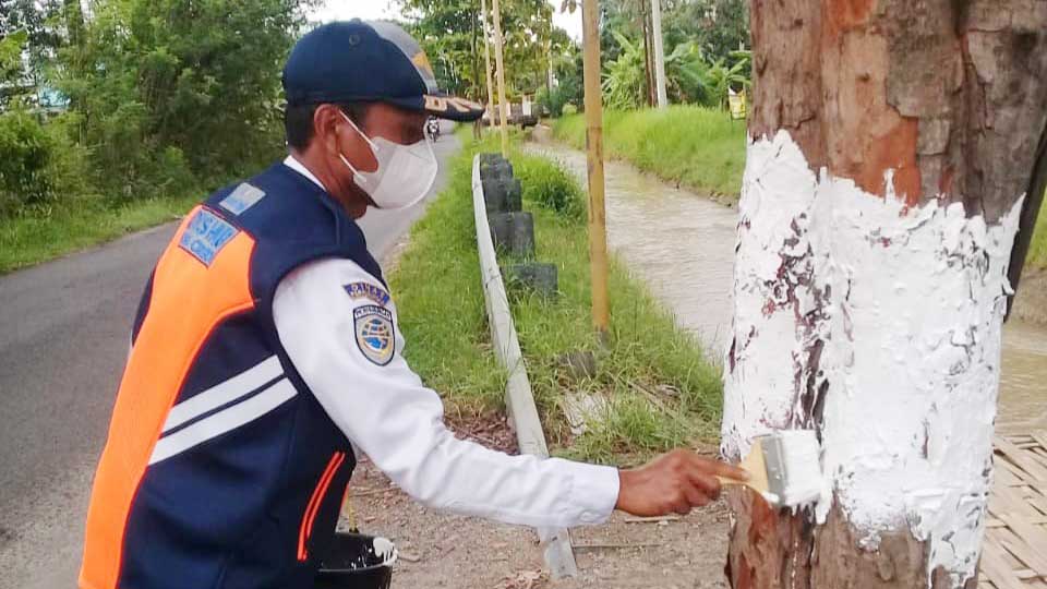 KABUPATEN CIREBON, SC- Sejumlah pohon di pinggir ruas jalan yang akan dilalui oleh para pemudik mulai dilakukan pengecetan oleh Dinas Perhubungan (Dishub) Kabupaten Cirebon. Pengecatan ini sebagai upaya pemberian tanda di jalan-jalan yang masih minim rambu lalu lintas maupun Penerangan Jalan Umum (PJU).