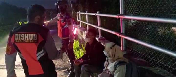 KABUPATEN CIREBON, SC- Dua orang pemudik terlihat kebingungan di pinggir jalan tol Cipali, tepatnya di bawah fly over wilayah Desa Tegalwangi, Kecamatan Plumbon, Kabupaten Cirebon, Jumat (29/4/2022) petang sekira pukul 18.20 WIB.
