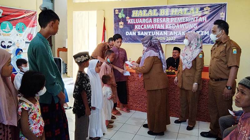 KABUPATEN CIREBON, SC- Pemerintah Kecamatan (Pemcam) Kedawung, Kabupaten Cirebon mengadakan halalbihalal dan memberikan santunan kepada anak yatim, berlangsung di aula kantor kecamatan setempat.