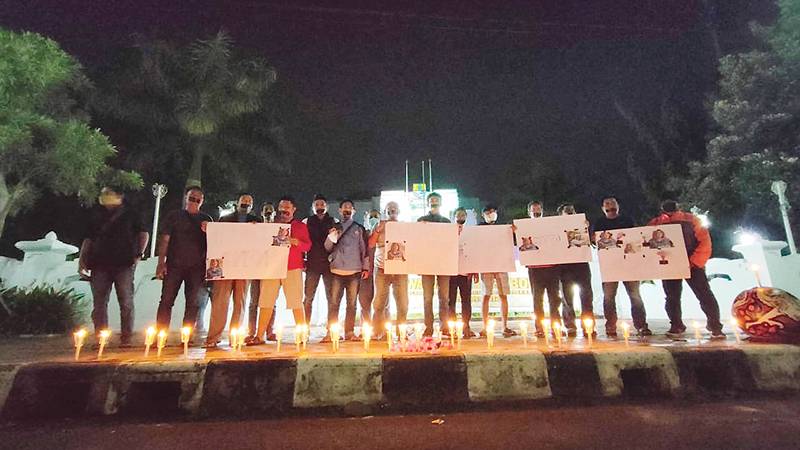Puluhan jurnalis Cirebon pun mengadakan aksi solidaritas dengan tutup mulut, tabur bunga dan menyalakan lilin, di depan Balai Kota Cirebon, Minggu (15/5/2022) malam.