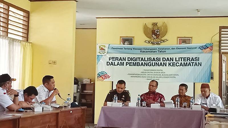 KABUPATEN CIREON, SC- Anggota DPRD Kabupaten Cirebon, H Mustofa dan H Subhan berserta perwakilan Kejaksaan Negeri Sumber, Hendra dan Komunitas Pariwisata dan Ekonomi Kreatif, Venggar Tri Laksono melakukan kegiatan Pembinaan tentang Wawasan Kebangsaan, Ketahanan dan Ekonomi Nasional dengan tema Peran Digitalisasi dan Literasi Dalam Pembangunan Kecamatan, di aula Kantor Kecamatan Talun, Rabu (18/5/2022).
