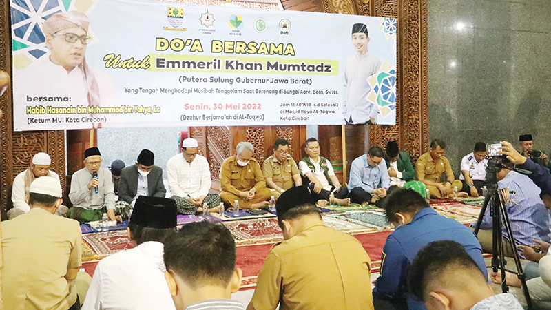 KOTA CIREBON, SC- Ratusan masyarakat Kota Cirebon memanjatkan doa di Masjid Raya At-Taqwa Kota Cirebon, untuk keselamatan Emmeril Kahn Mumtadz (Eril), putra sulung Gubernur Jawa Barat, Ridwan Kamil, yang menghadapi musibah tenggelam saat berenang di Sungai Aare, Bern, Swiss, Senin (30/5/2022).