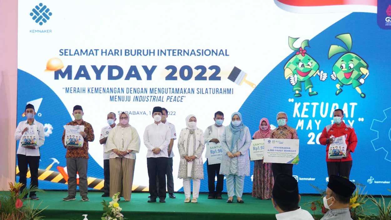 Terbaru, penyerahan sebanyak 4.000 paket sembako dilakukan oleh Direktur Pelayanan BPJAMSOSTEK, Roswita Nilakurnia pada kegiatan Ketupat May Day yang diselenggarakan oleh Kementerian Ketenagakerjaan di Gedung Al Marwah Masjid Nasional Al-Akbar Surabaya, Ahad (1/5/2022).