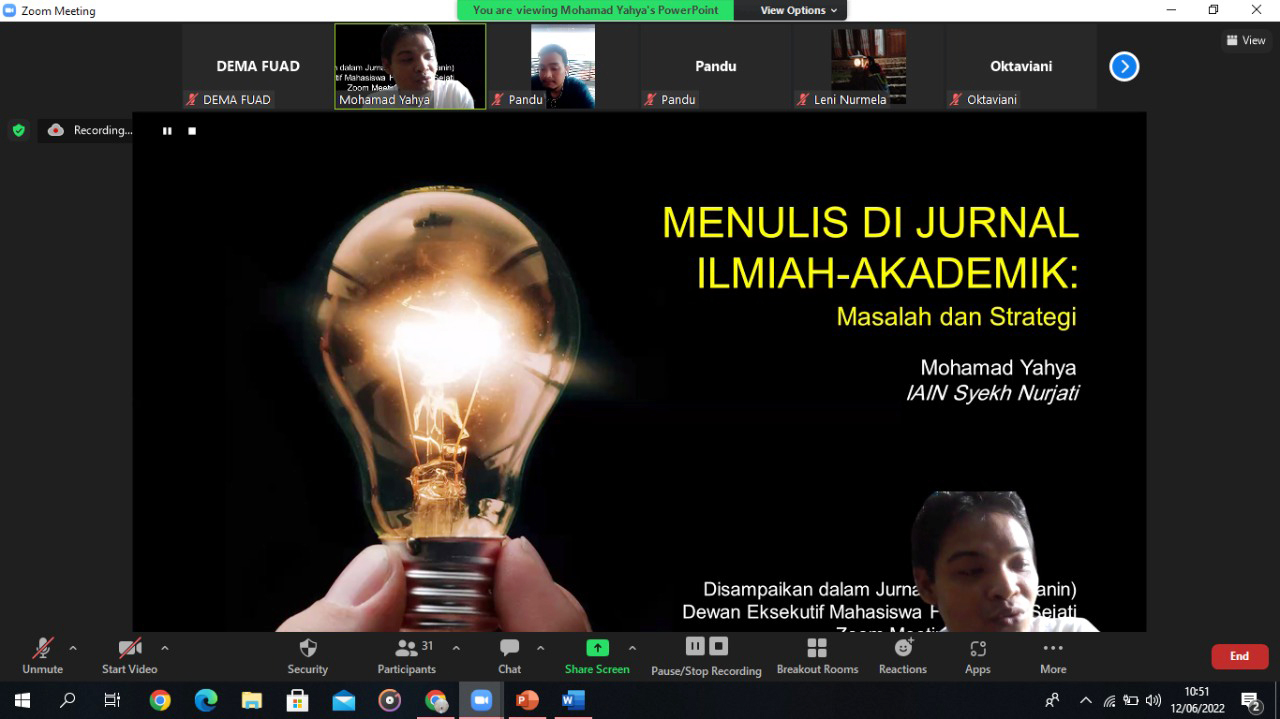 CIREBON, SC- Dewan Eksekutif Mahasiswa (DEMA) Fakultas Ushuluddin Adab dan Dakwah (FUAD) IAIN Syekh Nurjati Cirebon menggelar Jurnal Training (JALANIN) bagi mahasiswa fakultas setempat, Sabtu (11/6/2022).