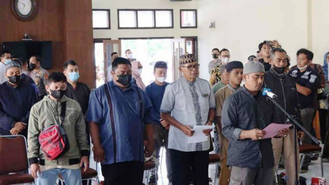 MAJALENGKA, SC- Sebanyak 12 jemaah Khilafatul Muslimin di Kabupaten Majalengka menyatakan keluar dari organisasi. Mereka juga berikrar untuk setia pada Negara Kesatuan Republik Indonesia (NKRI) dan Pancasila.