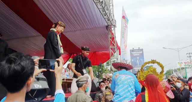 MAJALENGKA, SC- Ribuan warga antusias menyaksikan gelaran pawai seni budaya dan karnaval pembangunan dalam rangka Hari Jadi le-532 Kabupaten Majalengka.