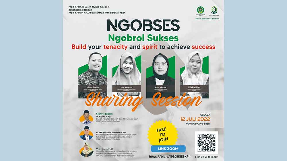 CIREBON, SC- Program Studi Komunikasi dan Penyiaran Islam (KPI) Fakultas Dakwah Dan Komunikasi Islam IAIN Syekh Nurjati Cirebon bekerjasama dengan Program Studi Komunikasi dan Penyiaran Islam (KPI) Fakultas Ushuluddin, Adab dan Dakwah UIN KH.Abdurrahman Wahid Pekalongan mengadakan kegiatan Webinar ‘Ngobes’ (Ngobrol Sukses), Selasa, (12/7/2022).
