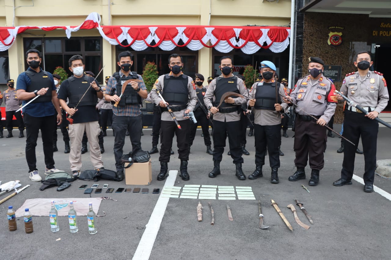 Selain itu, petugas juga berhasil mengamankan satu pucuk pistol air soft gun, puluhan senjata tajam yang terdiri dari parang, tombak, celurit, dan sejumlah senjata lainnya. Belasan unit sepeda motor dan mobil pun turut diamankan berikut minuman keras (miras), handphone.