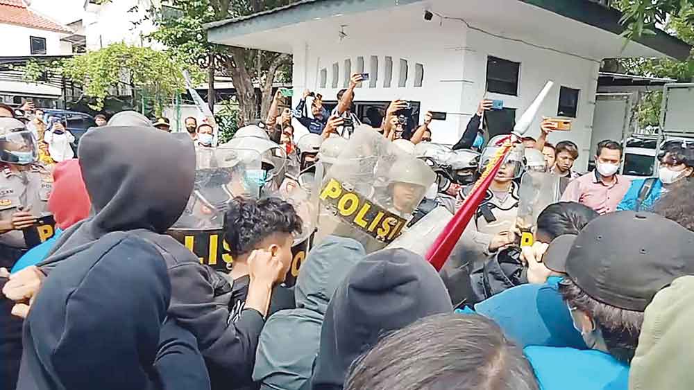 KOTA CIREBON, SC- Aksi saling dorong yang berujung ricuh antara mahasiswa dengan petugas kepolisian yang berjaga di depan Gedung DPRD Kota Cirebon tidak terelekan, dalam aksi demonstrasi menolak pasal kontroversial pada Rancangan Kitab Undang-Undang Hukum Pidana (RKUHP) dan kenaikan harga BBM, Senin (18/7/2022).