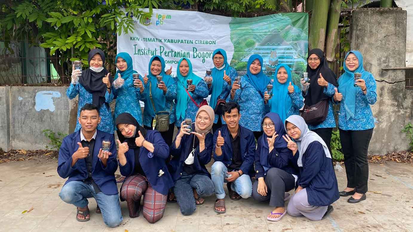 KABUPATEN CIREBON, SC- Mahasiswa Institut Pertanian Bogor (IPB) yang tengah melakukan Kuliah Kerja Nyata (KKN) di Desa Megu Gede bersama Pemerintah Desa (Pemdes) Megu Gede, Kecamatan Weru, Kabupaten Cirebon mengenalkan cara mengurangi sampah botol plastik dengan memanfaatkan limbah tersebut untuk pot tanam dengan cara mengairi sendiri (Self watering system).