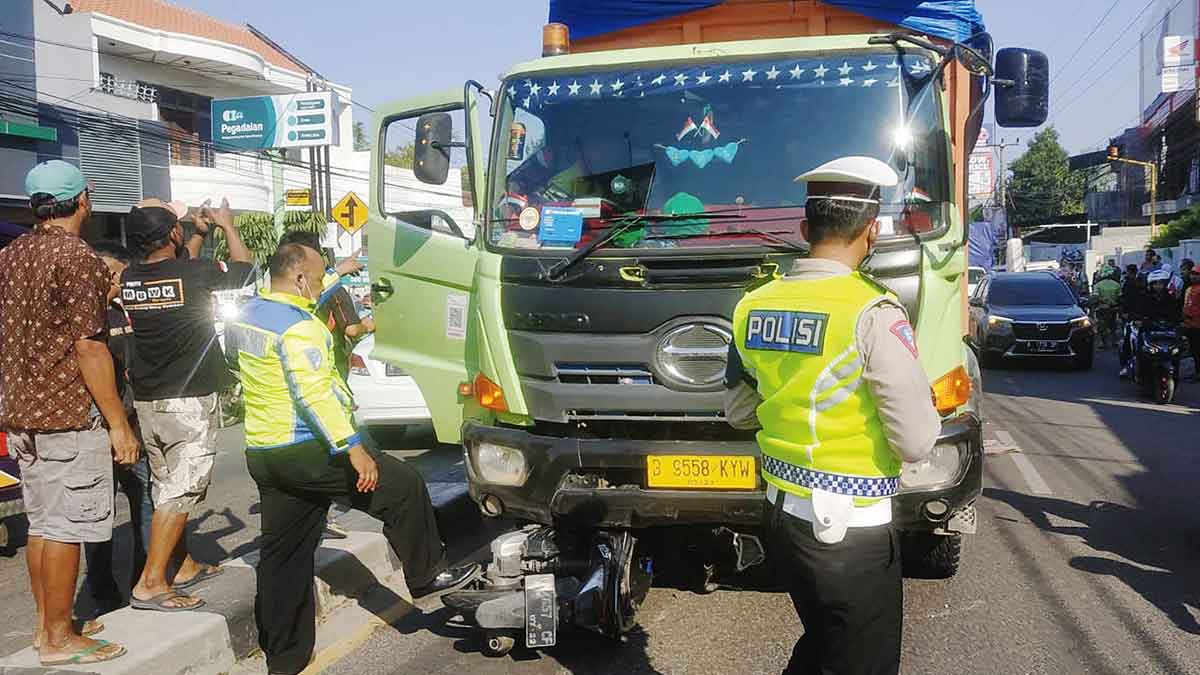 Akibat senggolan, motor pun oleng dan jatuh ke arah kanan bersama sang pengemudi. Nahas, pada saat bersamaan dari arah belakang lajur yang sama melaju kendaraan dump truk bernopol B 9558. KYW. Akibatnya, pengendara motor dan motor yang dikendarai tergilas dump truk tersebut dan meninggal di TKP.