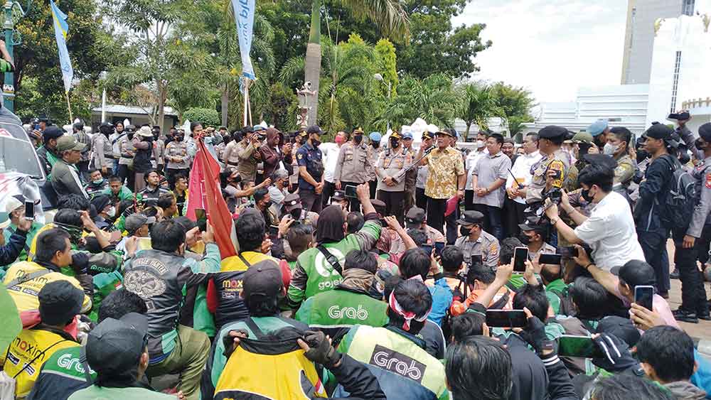 KOTA CIREBON, SC- Ratusan pengemudi ojek online (ojol) dari berbagai perusahaan di Kota Cirebon, melakukan unjuk rasa menolak kenaikan harga Bahan Bakar Minyak (BBM), Rabu (7/9/2022).