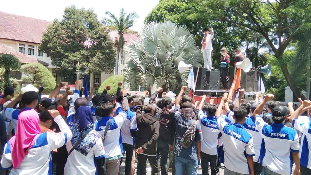 Kali ini, aksi penolakan dengan ancaman buruh mogok nasional dilakukan oleh Federasi Serikat Pekerja Metal Indonesia (FSPMI) Cirebon di depan kantor Bupati Cirebon, Kamis (15/9/2022).