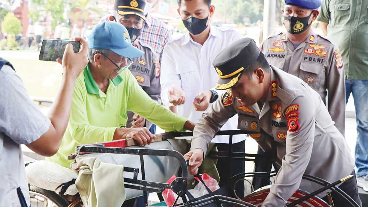 PARA tukang becak, pengemudi ojek online, dan ojek pangkalan mendatangi Mapolresta Cirebon, Rabu (21/9/2022).
